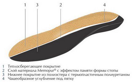 Бескаркасные ортопедические стельки с выраженной выкладкой продольных сводов, минимальным метатарзальным валиком и чашеобразным углублением под пятку. Имеют смягчающий слой из материала Memopur®, который в процессе носки приобретает индивидуальную форму и позволяет перераспределить давление на мягкие ткани стопы. Покрытие изготовлено из искусственного меха (полиэстер), низ стельки полимерный.